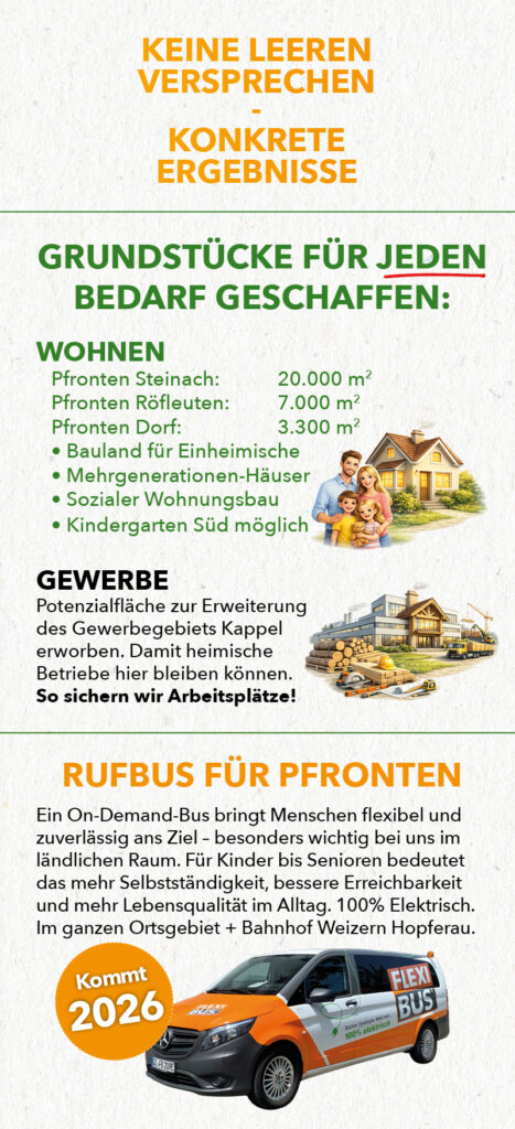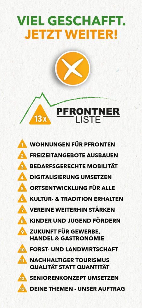 Wie schon aus der Vergangenheit bekannt nehmen wir uns auch jetzt wieder unter dem Motto „13x Pfronten“ in Anlehnung an die 13 Ortsteile neue Projekte, Themen und Ideen für Pfronten vor.