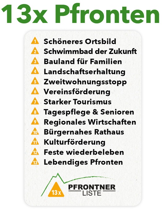 Mit kreativen, unabhängigen Persönlichkeiten und deren Ideen ist die Pfrontner Liste seit Jahrzehnten aktiv. Dabei haben wir bereits eine Vielzahl an gemeinsamen Zielen erreicht.